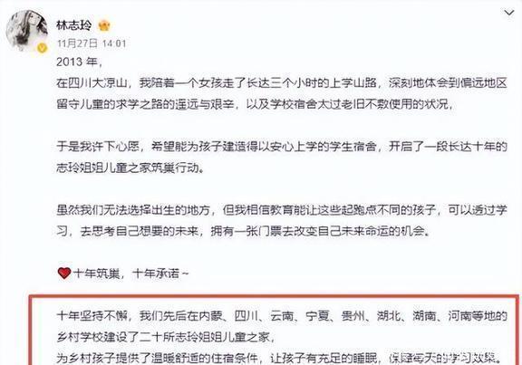 03 重回舞台林志玲心里也清楚,网上那些唾沫星子有多厉害。生完孩子后,她就说自己要退出演艺圈,之后就很少公开露面了,大家伙儿都以为她真的要在家相夫教子,彻底不管圈子里的事儿了。可眼尖的网友还是发现了,就算“退圈”了,林志玲也没闲着,一直在偷偷做公益。早在2013年的时候,她就陪着一个山里的小姑娘,走了三个小时的山路去上学,亲眼看到那些留守儿童上学有多不容易。从那以后,她就开始搞“志玲姐姐儿童之家”这个项目,一干就是十多年。